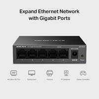 Quickly expand your wired network with five 10/100/1000 Mbps Ethernet ports—10 times faster than regular 10/100 Mbps Ethernet ports. MS105GS is flexible and fully compatible with 4K Ultra HD TVs, computers, printers, IP cameras, game consoles, and more. This makes it perfect for use in home, small office, and even dormitory environments.